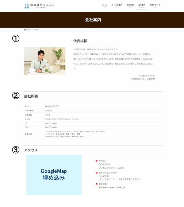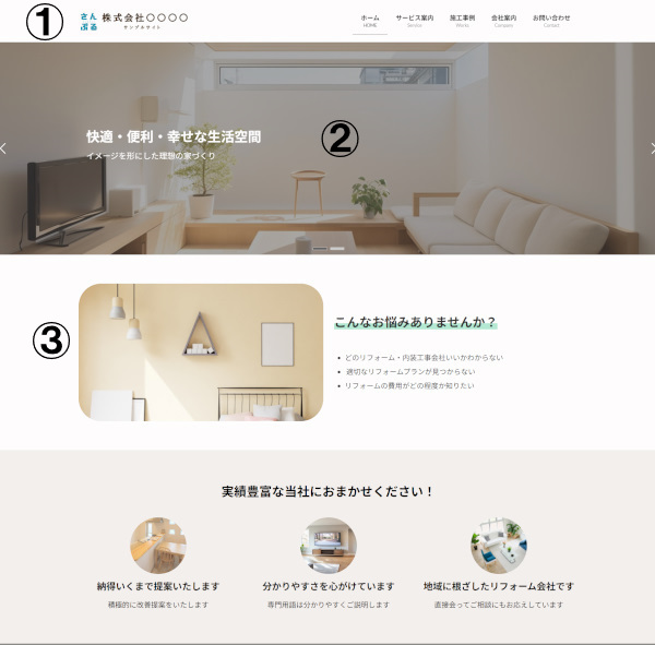 ①から③のブロックは共通しています。お客様とご相談しながら、ブロックに必要な画像や文章をご用意していきます。